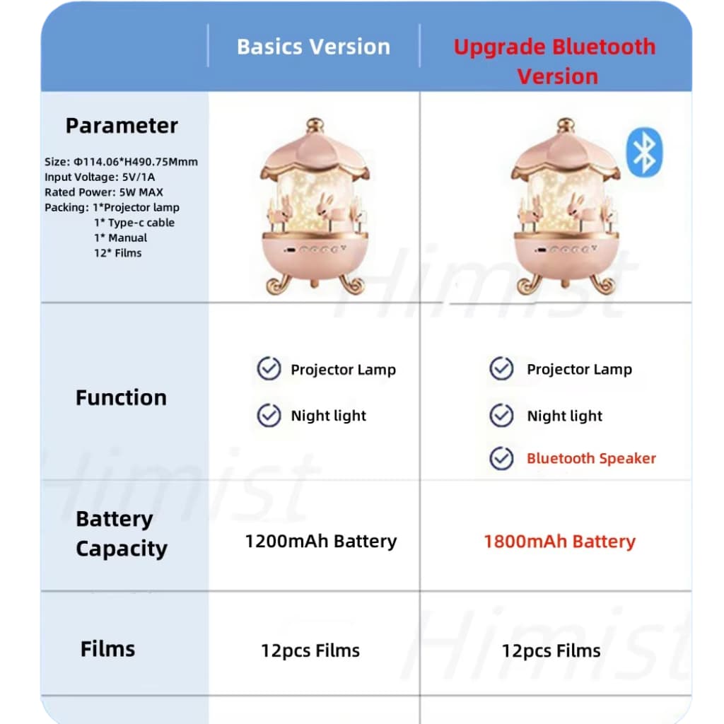 The basic version of the Magic Carousel Light is perfect for those seeking fun and practicality, offering a 1200mAh battery, 12 projection themes, and a fixed white light. Meanwhile, the Premium version takes the experience to the next level with a 1800mAh battery, enhanced projection with 21 exclusive themes, a built-in Bluetooth speaker to play music, and adjustable light colors (white, yellow, and blue). Ideal for anyone looking for a more magical and complete experience!